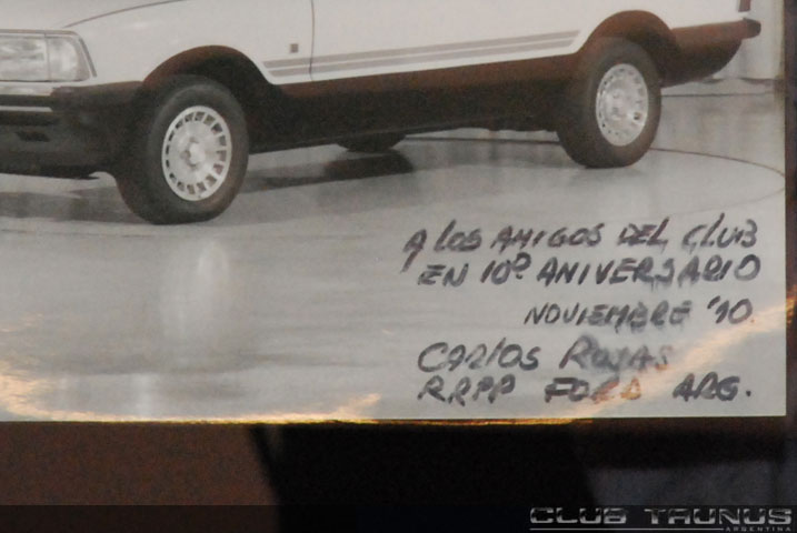 Mas tarde y luego de cenar comenzamos distinguiendo a Carlos Rojas, que nos emociono con sus palabras y nos obsequio una foto original y de época de la presentación de la coupe GT SP5 dedicada y firmada por él, algo tan importante y valorable para nosotros que ya forma parte de nuestro archivo. Luego llego el turno de Alejandro Schatz, responsable de Autopartes Ural, nuestro primer y fiel auspiciante que desde el 2001 nos acompaña con los repuestos y accesorios de nuestros Taunus para que sigan como el primer día.