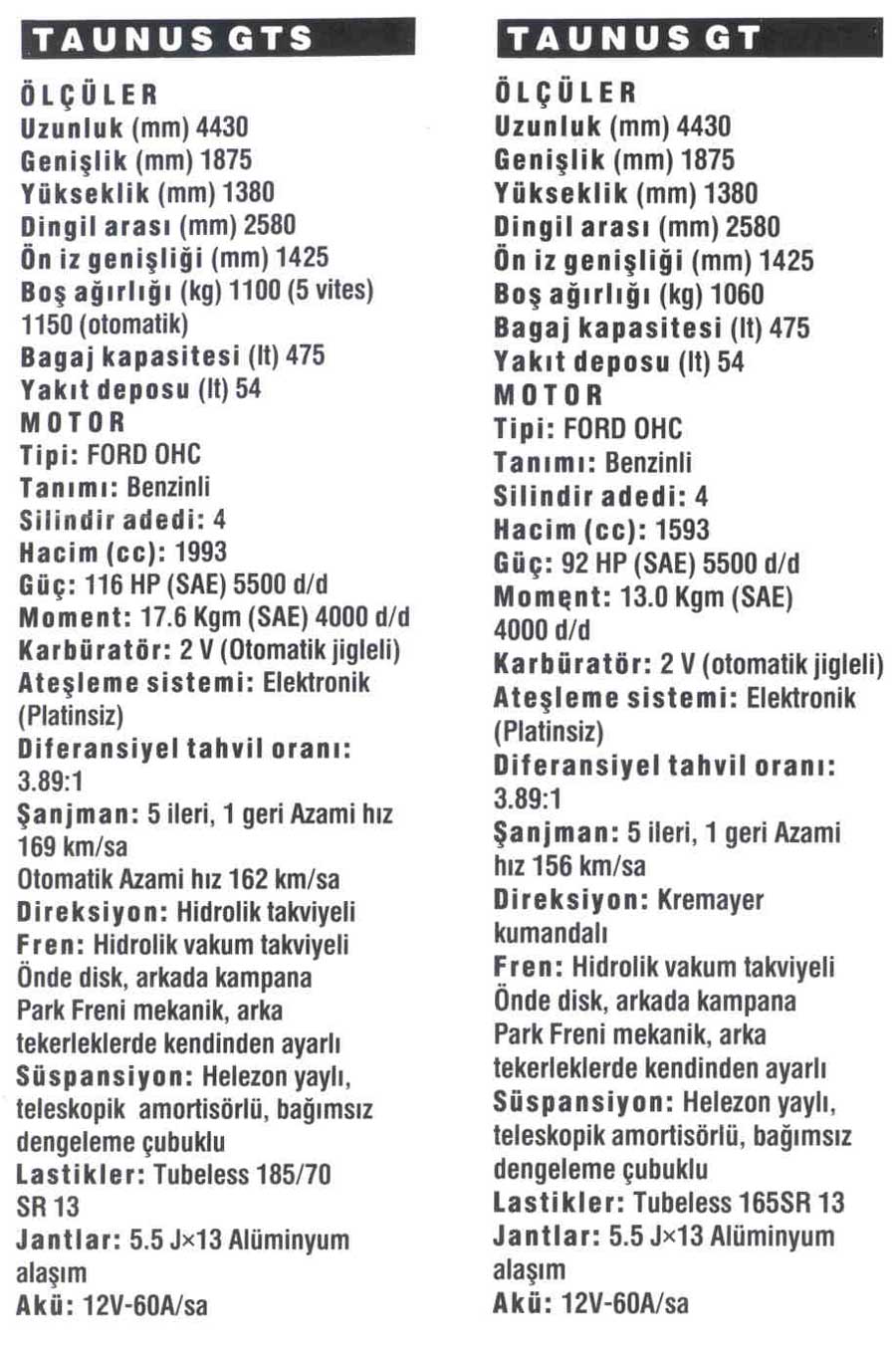 El Taunus mejor equipado de la historia fue el GTS, ya que disponía de estereo pasacasettes, vidrios eléctricos en las puertas delanteras, cierre centralizado de puertas, aire acondicionado, 4 apoyacabezas, dirección hidráulica, caja de quinta, etc.