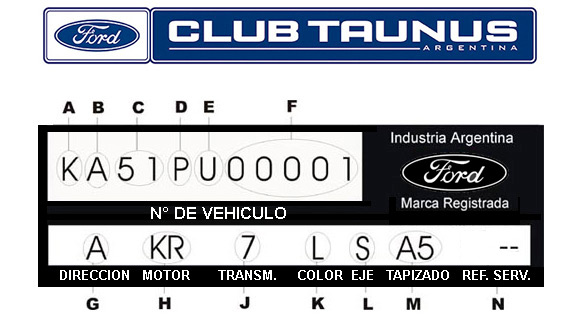 El número de serie del automóvil y otros datos importantes para poder identificar su Ford Taunus, se encuentran estampados en la Placa de Identificación, la misma se encuentra fijada en el extremo derecho del panel frontal del radiador.