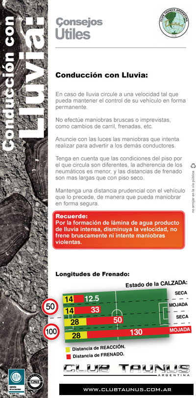 Sin entrar en tecnicismos, aclaramos que el gráfico ha sido trazado para un tiempo de reacción de 1.5 segundos y un coeficiente de roce neumático-calzada de 0.85. Naturalmente, las magnitudes expuestas aumentan significativamente si el pavimento esta mojado o resbaloso (lluvia, barro, nieve, manchas de aceite, etc.).