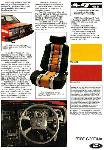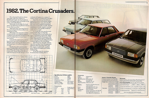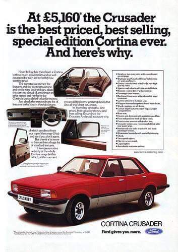 En estas fotos podemos ver el Cortina MK5, versión inglesa, en su edición limitada "CRUSADER". Pintura bitono, vidrios tonalizados, ambos espejos exteriores con control interno, paragolpes negros, tapizados de combinaciones nuevas y exclusivas, parlantes mejorados, radio AM/FM, entre otros detalles, se los podía adquirir en versiones GL y GLS.